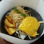この日は梅雨の合間の猛暑。あまりの暑さに生ビールを一杯。セルフサービスのサラダやスープをつまみながら、トリプルバーグとごはんを待ちます。意外と早く到着。ハンバーグは牛肉100%でさっぱりしてて、適度なボリューム。